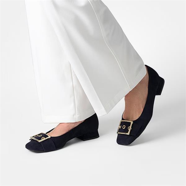 Step into effortless comfort with womens low heel pumps from Paul Green shoes. Crafted from smooth Navy suede leather offering optimal comfort. Featuring a chic square toe, a low comfortable heel, and an adjustable buckle across the toe for a refined finishing touch. The perfect shoe for all your outtings.