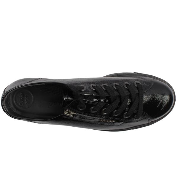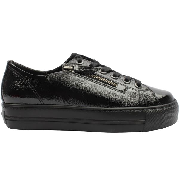 Sporty meets chic style with these black patent trainers from Paul Green shoes. Designed in a sleek high-shine finish, they feature both lace-up and side-zip closures for a perfect blend of style and convenience. Paul Green Shoes "Super Soft" technology enhances the comfort, providing a plush fit and feel & provides effortless wearability. A versatile choice that pairs just as well with casual denim as it does with smart-casual looks, these trainers bring modern elegance to everyday footwear.