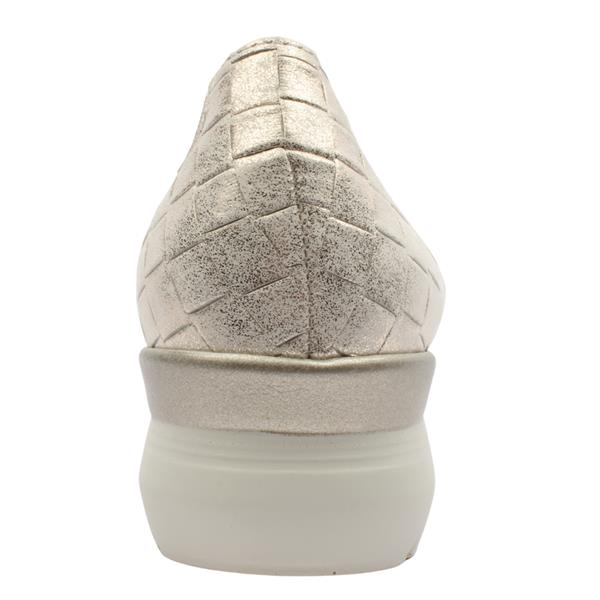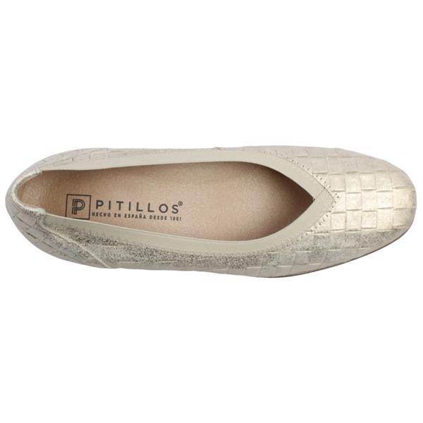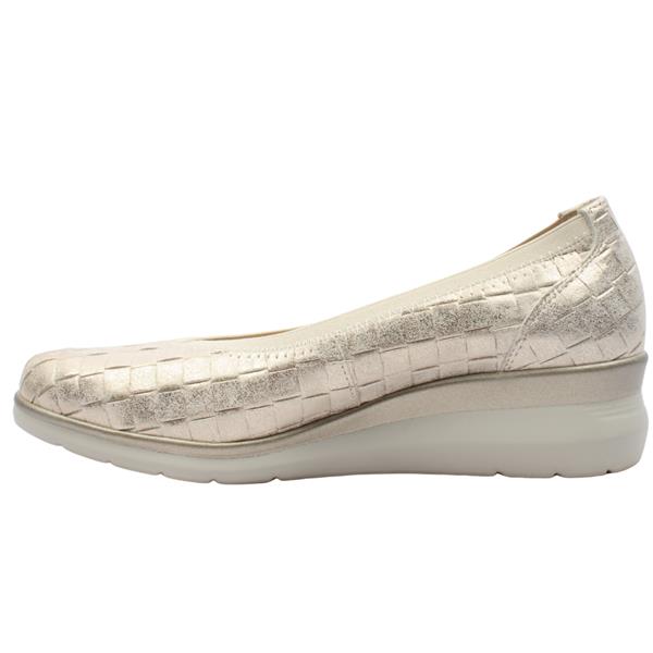 Stylish ladies shoes from Pitillos Shoes. These shoes have a chic gold, textured upper. Crafted with a soft leather upper and elastic trim around the rim, this shoe offers both comfort and support, ensuring a secure fit throughout the day. A Cushioned Removable Leather Insole which is Soft and breathable for all day comfort, with the option for custom orthotics. The low wedge sole Offers a subtle lift for added height without compromising on stability or comfort. A versatile shade that complements a wide range of outfits, from casual to dressy.