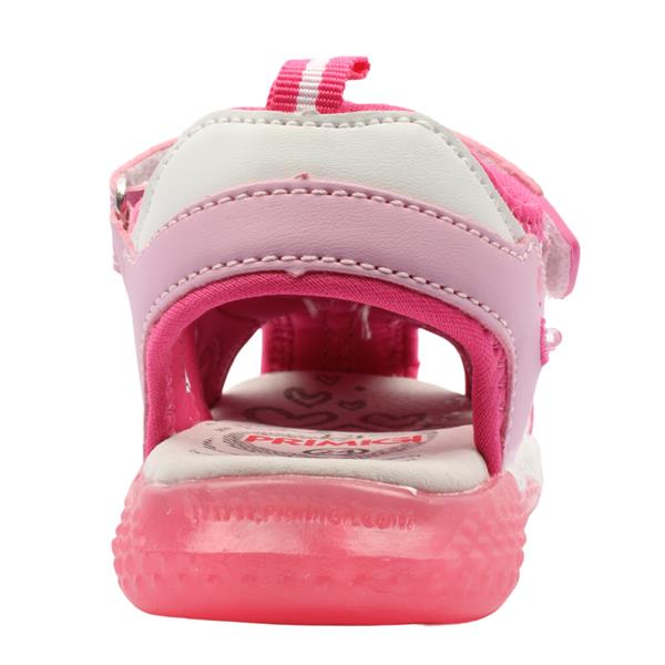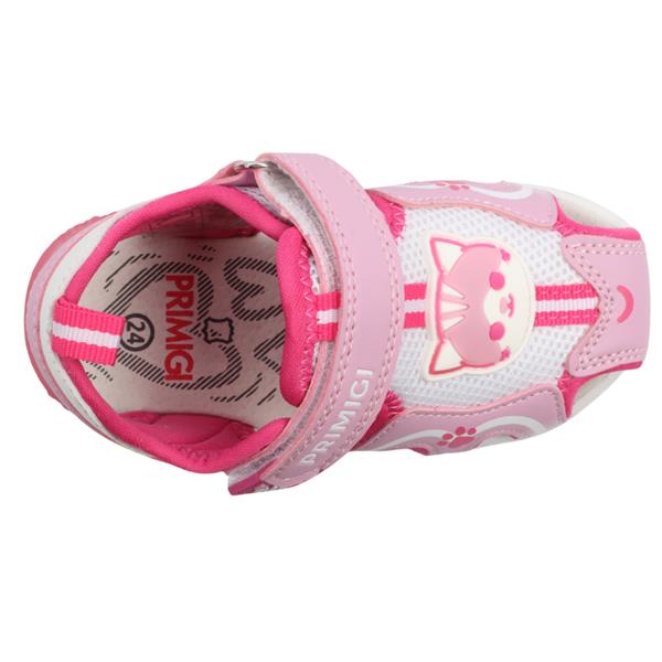 Little girls closed toe sandals from Primigi Shoes, 1457100 in pink with kitten detail are a cute addition to your little ones summer wardrobe. These girls sandals are built for comfort and adventure thanks to the closed toe design which offers extra protection. The Velcro straps ensure a snug and supportive fit. Lightweight and breathable, these girls sandals are ideal for sunny days full of play.