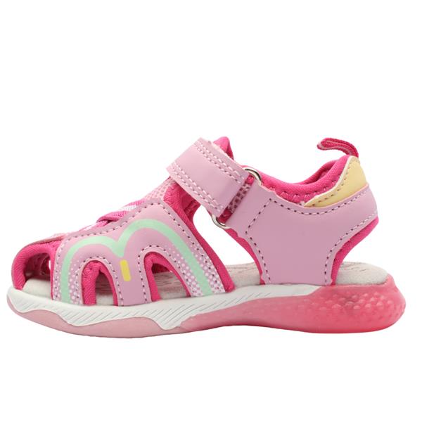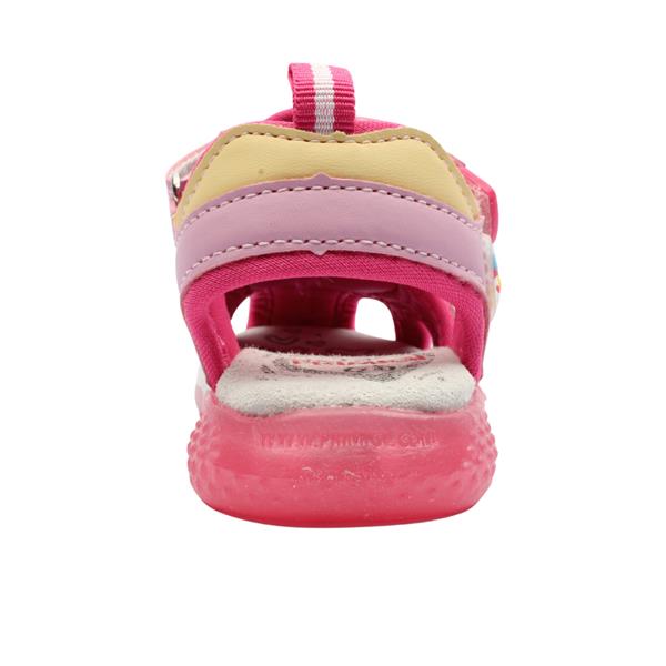 Adventure-ready and built for comfort, the Primigi 7955511 Girls Closed Toe Sandal in pink is perfect for little explorers. Featuring a fun unicorn design on the side and a flashing pink light in the outsole, every step brings a touch of inspired excitement. The closed toe design offers extra protection, while the Velcro ankle strap ensures a snug and supportive fit. Lightweight and breathable, it's ideal for sunny days full of play.