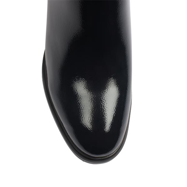 Crafted in a rich navy patent finish, this chic ladies ankle boot boasts a subtle shimmer effect along the back panel and ankle strap—adding just the right touch of glamour. The rounded toe keeps the look timeless, while the sturdy block heel offers all-day comfort and a stylish lift. Finished with elegant silver detailing for a modern edge, this versatile boot pairs effortlessly with both casual and dressier looks.