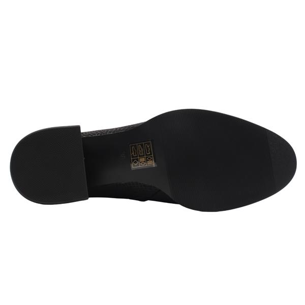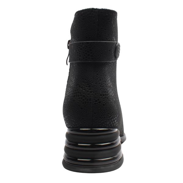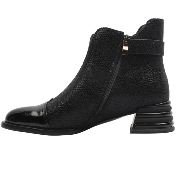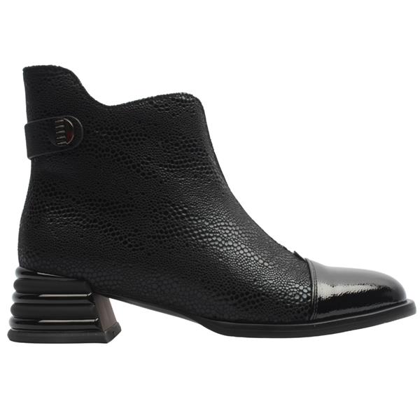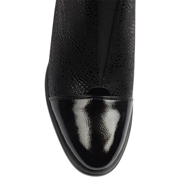 This eye-catching Ladies Ankle Boot design blends glossy patent with textured detailing for a modern, elevated look. The shaped top and front elastic panel ensure a secure, comfortable fit, while the stylish low sculpted heel adds subtle height without sacrificing all-day wearability. A distinctive detail on the back of the ankle completes the look, giving this boot a chic edge from every angle.