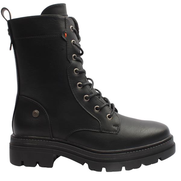 Make a statement with these chunky biker boots inspired style from Refresh shoes. Featuring a sleek black upper with a bold silhouette, they combine tough luxe style with practical comfort. The lace up front adds classic biker detailing, while the side zip ensures easy on and off wear. The padded insole adds t the comfort of these boots.