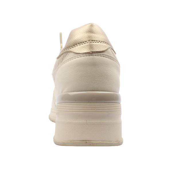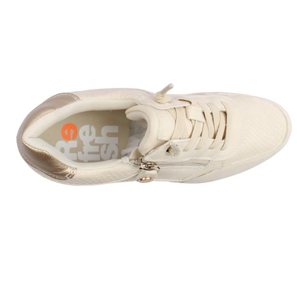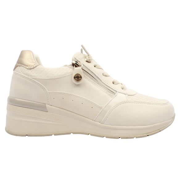 Step up your everyday look with the Ladies shoe by Refresh shoes. Featuring a beige upper, elasticated laces, and a convenient side zip closure, this shoe is easy to slip on and secure for all-day wear. Designed with a subtle elevated heel and a removable insole allowing an adjustable and comfortable fit.