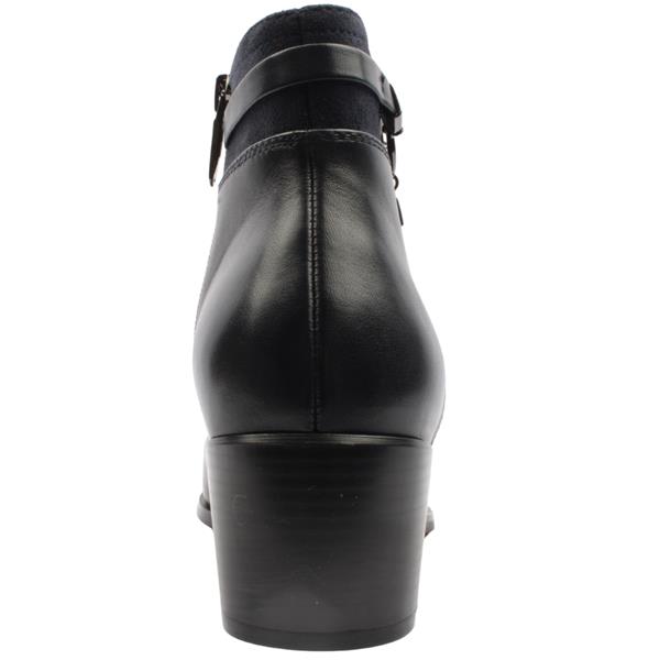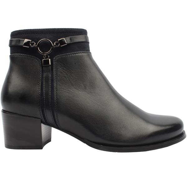 Elevate your everyday style with this elegant ankle boot from Regarde le Ciel shoes crafted from a dark navy leather upper.. This boot features a distinctive circular chain detail that wraps around the ankle, adding a bold yet refined edge. Finished with a comfortable block heel and a practical side zip closure, this versatile boot effortlessly blends fashion and function.