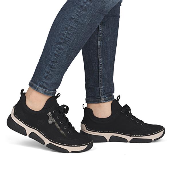 Brand: Rieker Style: 45973-00 Colour: Black Removable Insole: No Closure Lace (Zip is decorative) Heel Height: Approx 3 CM Materials: Synthetic/textile upper, textile lining, leather insole & manmade sole
