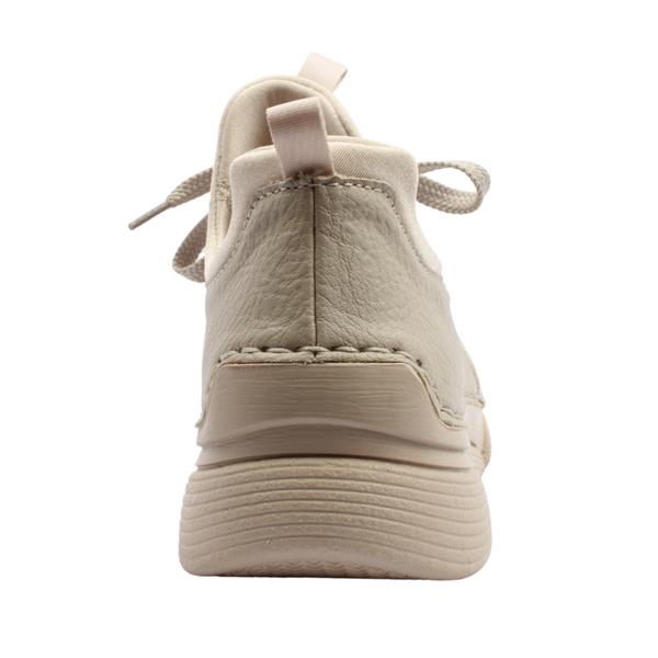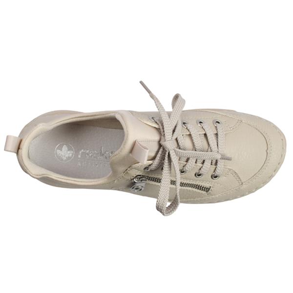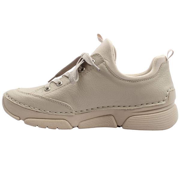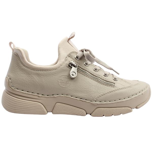 Step into all day comfort with these casual trainers from the ladies Rieker Shoes collection. These shoes are crafted using a neutral beige upper with stitch detailing. They feature a sock like lining and a lace closure to keep the shoe secure on the foot.(The zip is purely decorative). The leather Rieker Antistress insole provides outstanding shock absorption and pressure relief making these shoes a perfect choice for everyday wear.