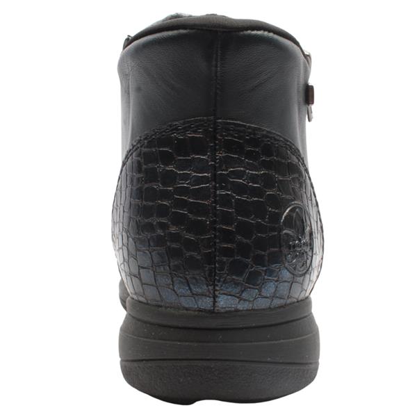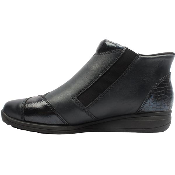 Wide fitting ladies boots from the Rieker shoes collection. These ladies Rieker boots have a versatile navy upper with textured panels. A side zip closure & elasticated side panel ensure easy on/off. The RiekerTex lining ensures this boot is shower proof keeping your feet dry. Inside a cosy lining will keep feet cosy and warm in cooler months.