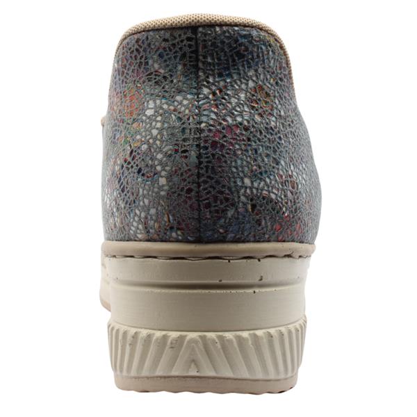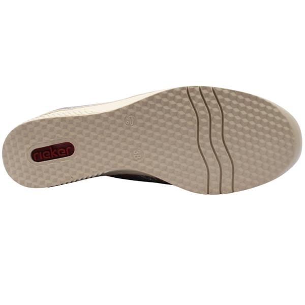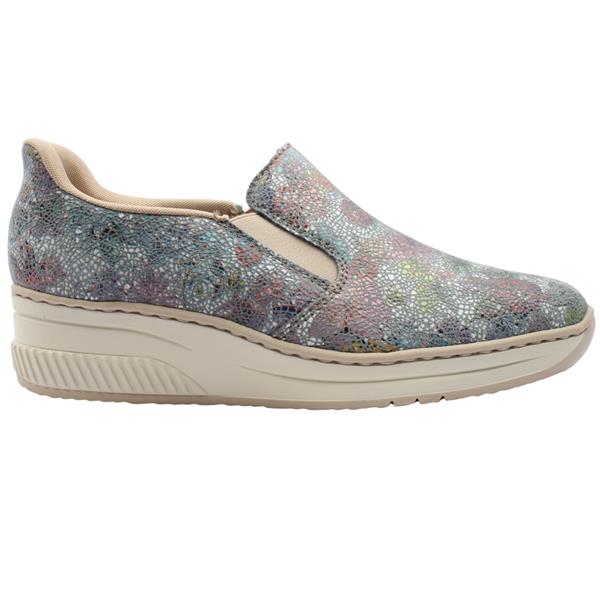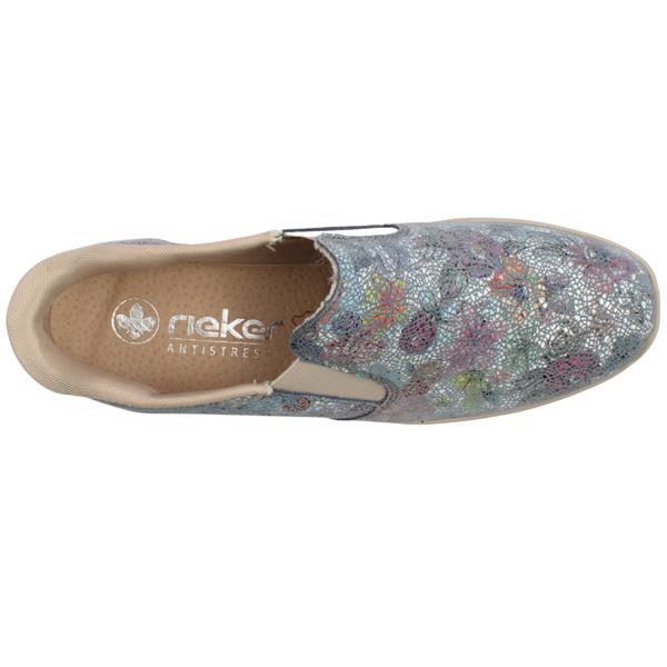 Ladies slip on shoes from Rieker Shoes in a stylish blue multi upper. The Rieker 48761 presents a combination of convenience and style with the elastic gussets that ensure they are an easy style to slip on/off. The leather Rieker Antistress insole provides cushioned support that adapts to your foot, ensuring all-day comfort.