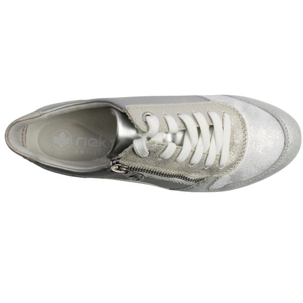 Enjoy stylish comfort in the Ladies Rieker Shoes 49003-91, featuring a silver shimmer effect upper.Created in an extra wide fitting, these shoes offer enhanced room and comfort, making them ideal for those who need a more accommodating fit. The combination of lace & side zip closure ensures a secure fit with easy on/off. Thoughtfully designed for sensitive or problem feet, a soft, flexible material on the outside of the foot helps reduce pressure and improve comfort. Practical, supportive and stylish, these Rieker shoes are perfect for all day wear.