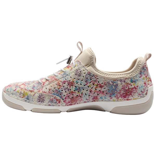Discover effortless style and everyday comfort with the Rieker shoes 55967, ladies slip on shoes in a beautiful multi-coloured upper. Designed for easy wear, the elastic lace system allows for a secure, flexible fit while making it simple to slip on and off perfect for busy days. Inside, the cushioned leather Rieker Antistress insole provides excellent underfoot comfort and support, helping to reduce fatigue for all-day wear. The lightweight, flexible outsole enhances natural movement and adds durability, making this shoe a practical yet stylish choice for everyday activities. With its eye-catching multi upper and relaxed, comfortable design, the Rieker 55967 is ideal for women who want effortless style without compromising on comfort.