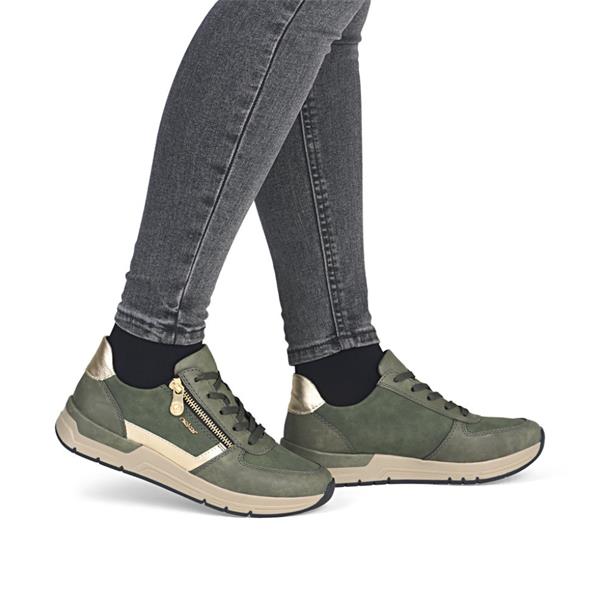 Step into comfort and style with these casual ladies Rieker shoes, crafted to add flair to your everyday wardrobe. These eye-catching shoes feature a khaki green upper accented with gold detailing. The lace and zip closure offers both adjustable fit and easy on-off convenience, while the padded Rieker Antistress insole ensures all-day comfort and support. Whether you're running errands or meeting friends, these versatile shoes bring fashion and function together effortlessly.