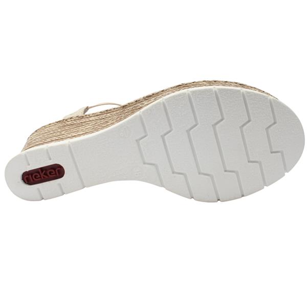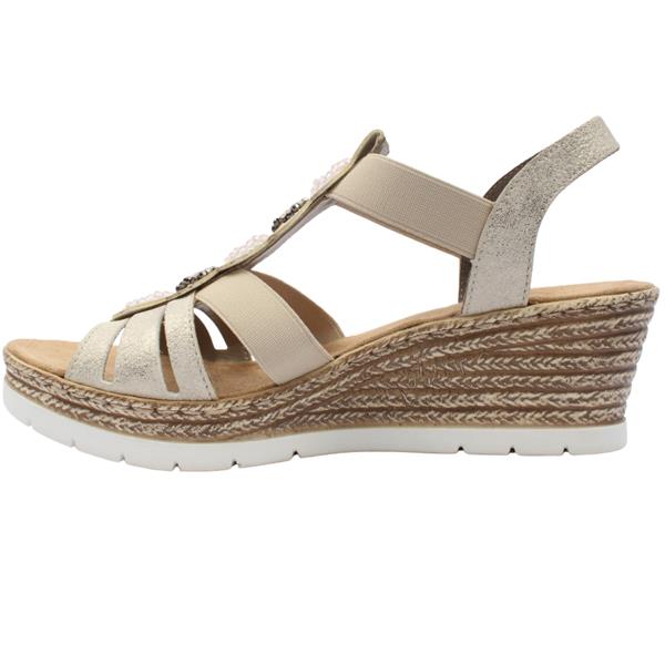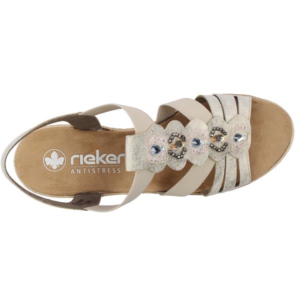 Elevate your summer style with these elegant Rieker ladies wedge sandals. Featuring a soft beige upper, they are designed for both comfort and sophistication. The front strap is adorned with sparkling jeweled detailing, adding a touch of glamour to any outfit. The slip-on design with elasticated straps ensures a secure, flexible fit, making them easy to wear all day. Inside, the Rieker Antistress insole provides cushioned support, flexibility, and shock absorption, keeping your feet comfortable whether you’re walking, shopping, or enjoying a casual outing.