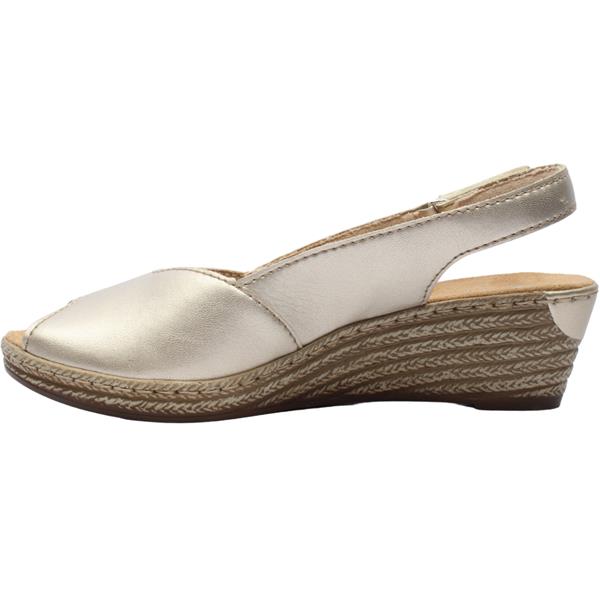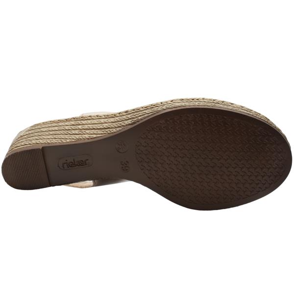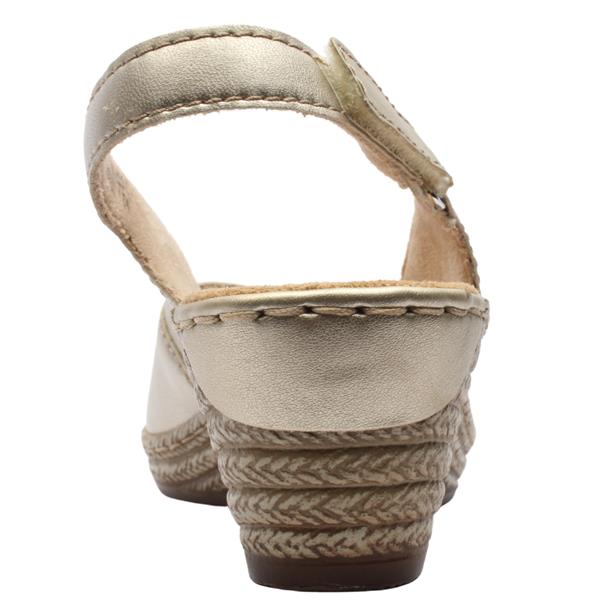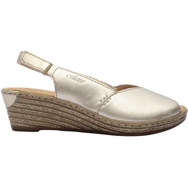 Stylish low wedge sling backs from the Ladies Rieker Shoes. This chic design features a gold upper with a slingback strap with a Velcro closure, ensuring effortless wearability. With its flattering V-shaped front that complements the natural foot shape, this style exudes sophistication. Additionally, it offers a cushioned soft leather insole and leather lining for enhanced comfort. Completed with a flexible and durable outsole, these espadrilles are both stylish and practical.