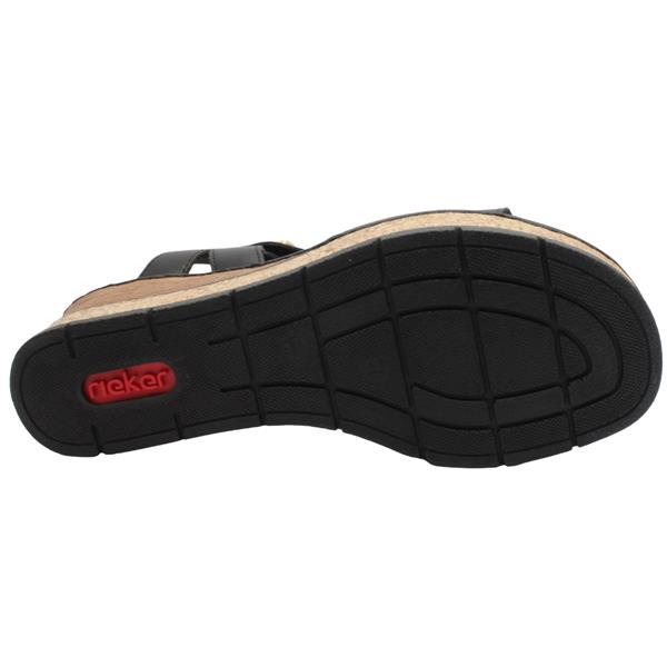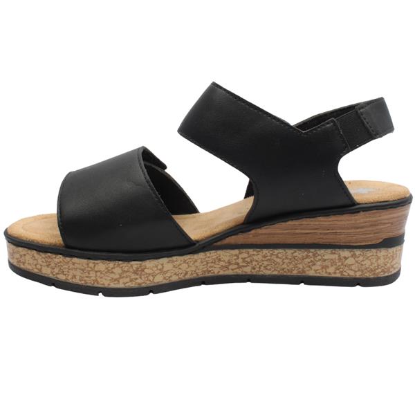 Step into everyday comfort with these stylish Rieker wedge sandals. Designed with a sleek black upper accented by elegant gold detailing, they add a subtle touch of glamour to any warm-weather outfit. The 5.5 cm wedge sole offers gentle height while remaining lightweight and stable for all-day wear. Two adjustable velcro strap closures ensure a secure, customisable fit, making these sandals easy to slip on and off. Finished with Rieker Sandals signature Antistress padded insole, they provide excellent cushioning, flexibility, and shock absorption for lasting comfort throughout the day.