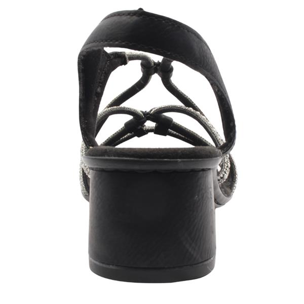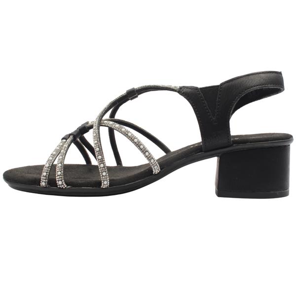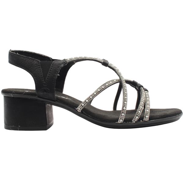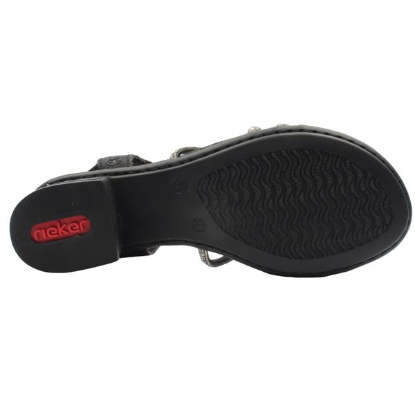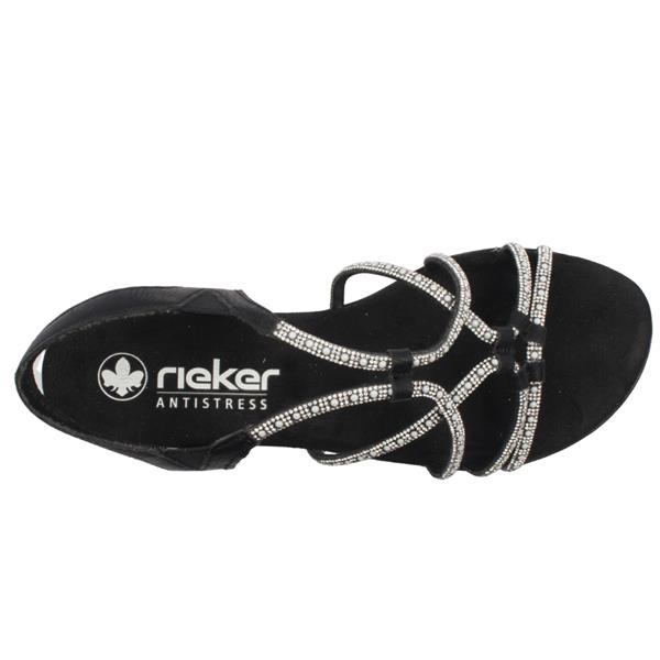 Add a touch of elegance to your summer wardrobe with Ladies low heel dressy sandals from Rieker shoes. Featuring a black upper enhanced with a strappy diamante detail bringing a refined sparkle to everyday looks. The easy slip on design with double side gussets provides flexibility and a secure fit. Finished with Rieker Shoes signature Antistress insole this sandal delivers lightweight cushioning