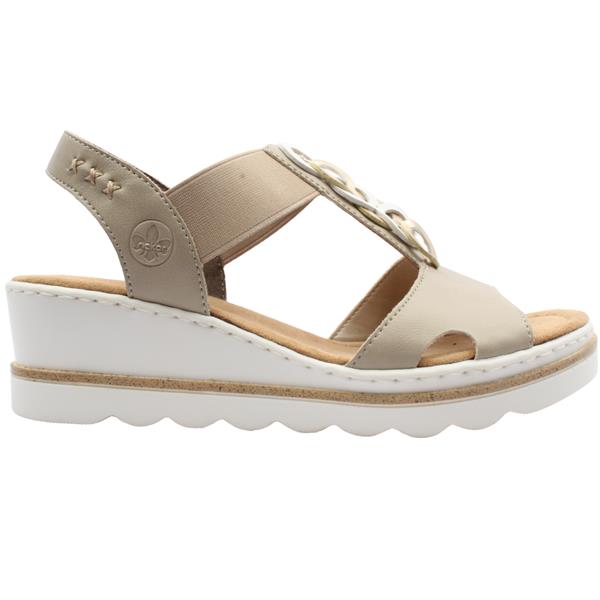Stunning wedge sandals from our ladies Rieker sandals range. Featuring a versatile beige upper accented with circle design pattern detailing, this sandal exudes sophistication. The slip on design with elasticated straps ensures easy on/off while providing a secure fit for the foot. Enhanced with Rieker Shoes antistress insoles and a wedge heel, this sandal prioritises comfort without compromising style.