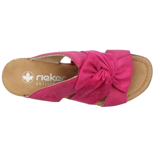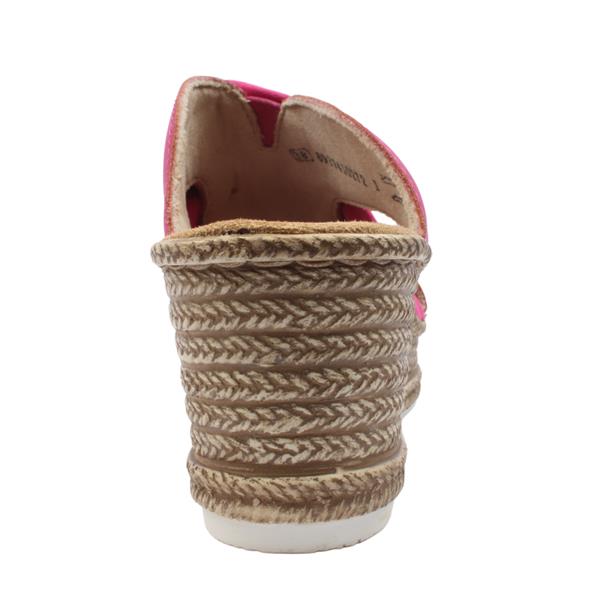 Brighten up your summer wardrobe with these chic Ladies Rieker Sandals 68789. These wedge slip on sandals have a vibrant fuchsia pink upper. Featuring a playful bow detail on the front, these mules add a feminine touch to any outfit. The espadrille style wedge heel provides a perfect blend of casual elegance and comfort, making them ideal for sunny days and stylish evenings alike. Easy to slip on, these mules are a must-have for effortless style and versatility.