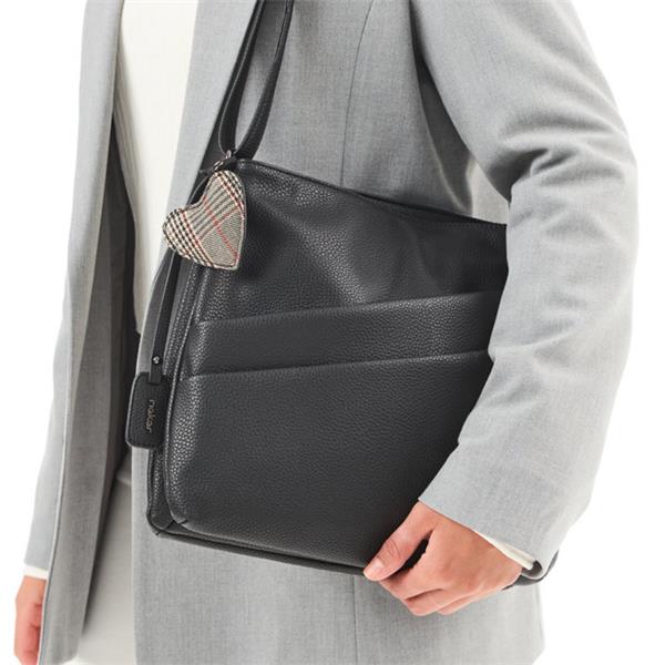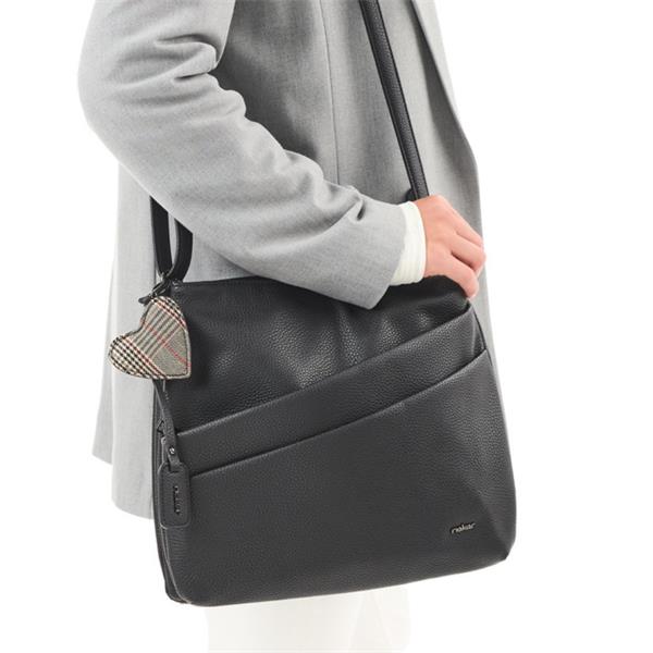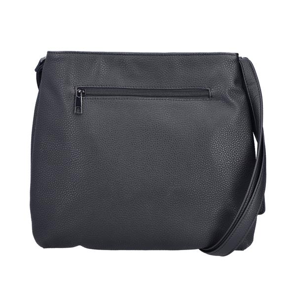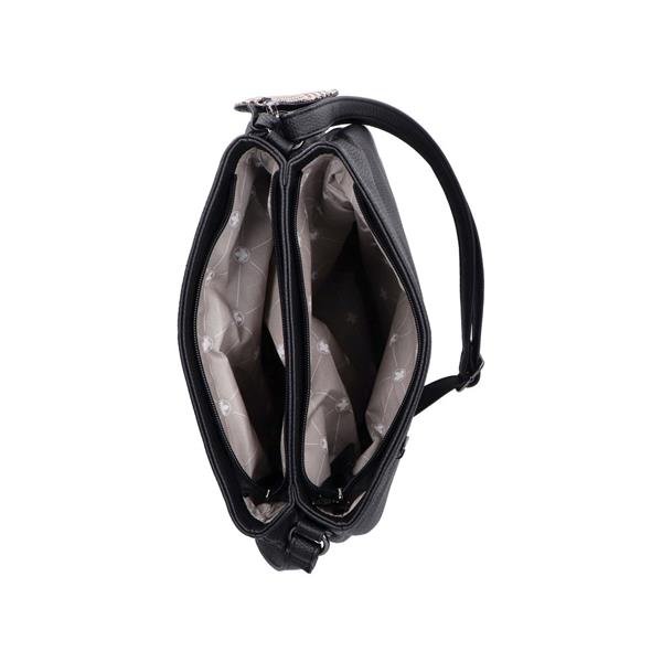 A stylish crossbody bag from Rieker. A classic black handbag for everyday use. Equipped with two primary compartments and two smaller pockets, each featuring a secure zip closure & one small front pouch with a button closure. Complete with a long adjustable shoulder strap, it offers both functionality and fashion