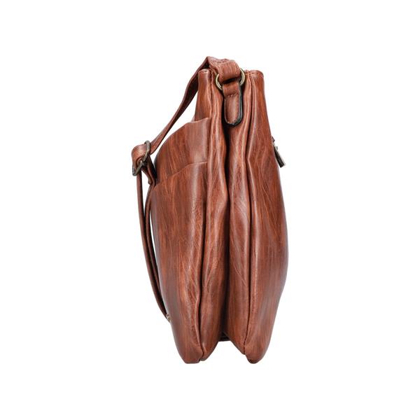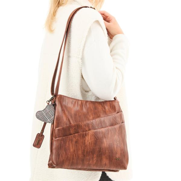 A stylish crossbody bag from Rieker. A classic handbag for everyday use. Equipped with two primary compartments and two smaller pockets, each featuring a secure zip closure and one small front pouch with a button closure. Complete with a long adjustable shoulder strap, it offers both functionality and fashion