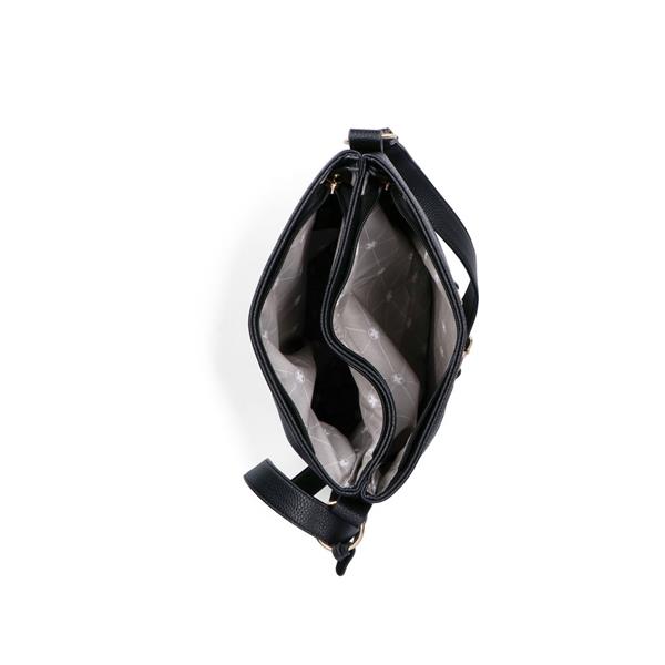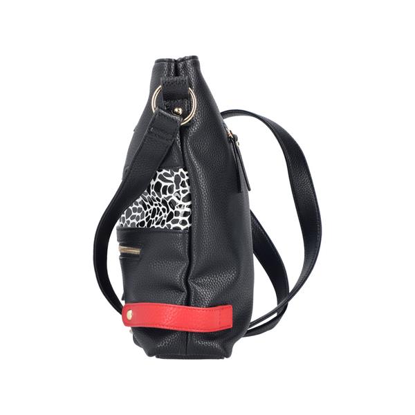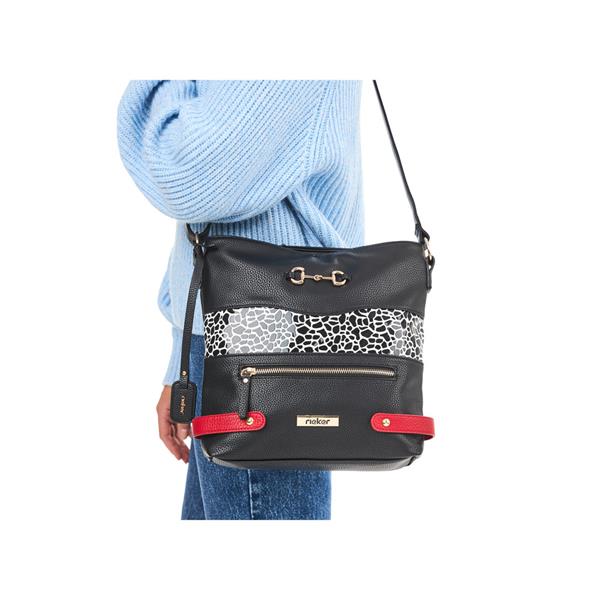Stylish crossbody bag for women from Rieker. A black bag boasting animal print and red detailing. This ladies handbag bag is equipped with two primary compartments and two smaller pockets, each featuring a secure zip closure. Complete with a long adjustable shoulder strap, it offers both functionality and fashion