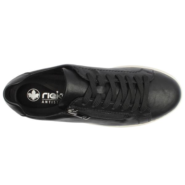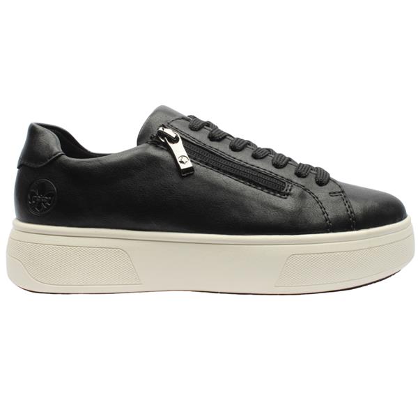 Casual style & all day comfort combined in these Ladies Rieker shoes M7701. A platform trainer in a versatile all black upper with off white sole. Featuring a combination of side zip & lace, these Rieker shoes ensure a snug fit. The Rieker Antistress insole provides superior cushioning and support, reducing fatigue for all-day wear. A subtle platform sole adds height and a trendy edge without compromising stability or comfort. These shoes feel as light as they look, complementing your active lifestyle.