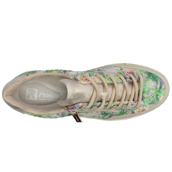 Step into standout comfort with these stylish Ladies trainers from Rieker Shoes. Designed with a fresh floral aesthetic, these shoes feature a vibrant green and pastel multi-colour upper that adds a unique, eye-catching touch to any casual outfit. The combination of soft synthetic materials and subtle shimmer detailing creates a modern yet feminine look. The lace closure ensures a secure and adjustable fit, while the cushioned insole provides all day comfort. Finished with a lightweight platform sole adorned with a botanical print, these trainers deliver both style and practicality. These Rieker Shoes are crafted using antistress technology, making them lighter, more flexible, and shock absorbing for everyday wear.