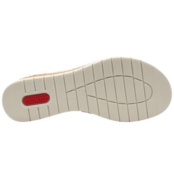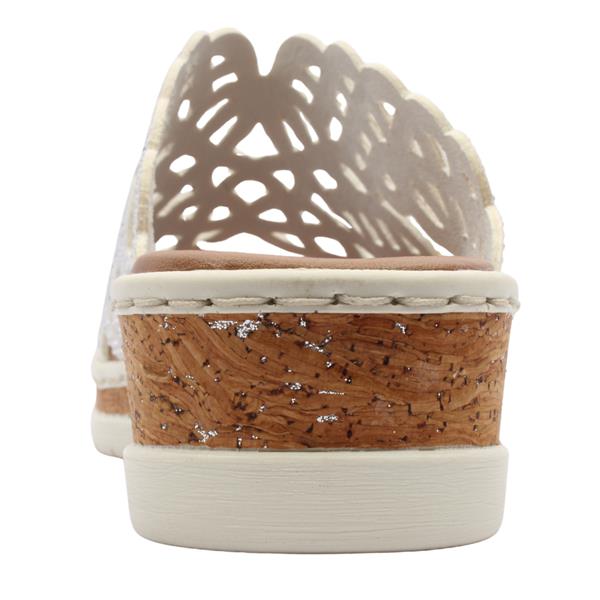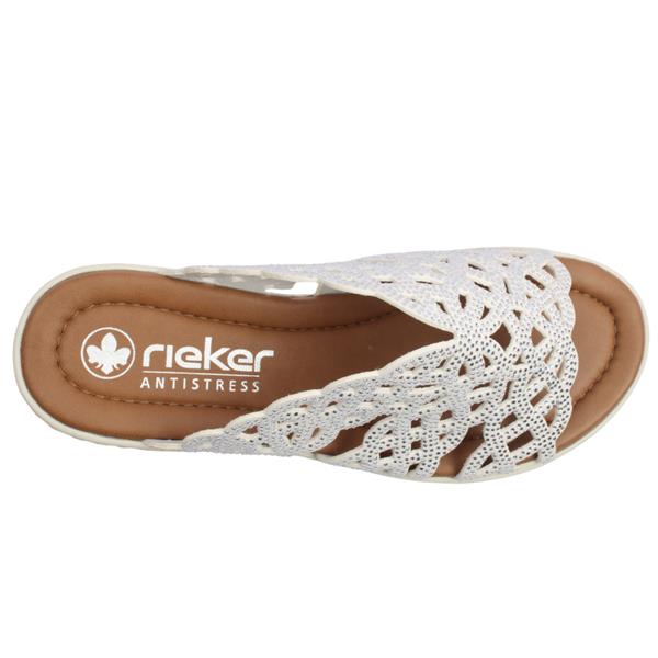 Womens slip on sandals from Rieker shoes. This lightweight sandal features a soft white perforated upper that allows for breathability on warmer days. The easy slip on design ensures convenience while the elevated sole provides gentle lift and all day cushioning.