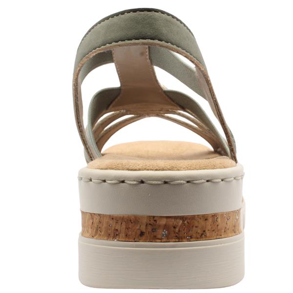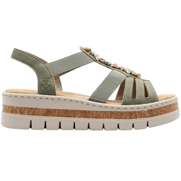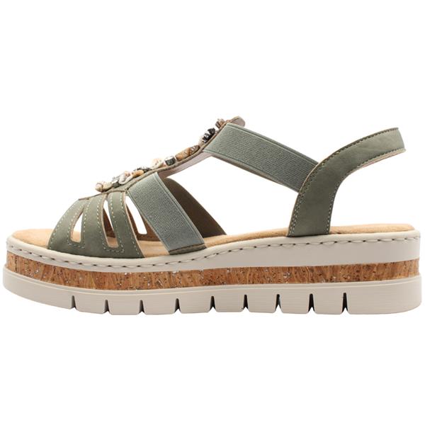 Womens Rieker V4949 sandals designed for summer strolls and comfort. Elasticated gussets on the upper allow for an easy slip on fit while providing flexibility and support. The soft Antistress insole delivers exceptional cushioning and shock absorption. Finished with a chunky sole this sandal offers both stability and a modern on trend edge.