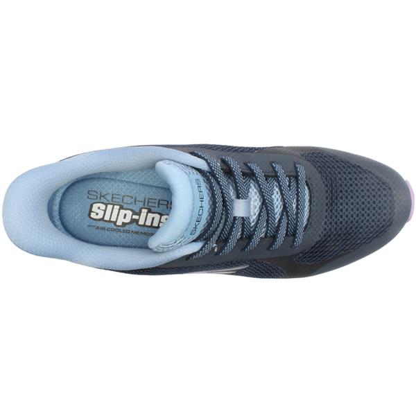 Step into effortless comfort and style with the Skechers womens slip ins. Crafted with an athletic mesh upper in a navy lavender color scheme, offering breathability. Equipped with Skechers exclusive Heel Pillow and Hands Free Slip ins technology, allowing for easy on and off. Features stretch laces that adapt to your foot's movement providing a secure and flexible fit.