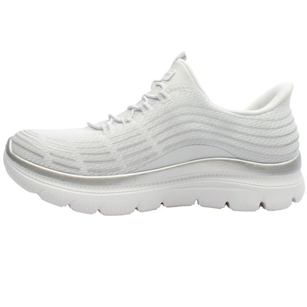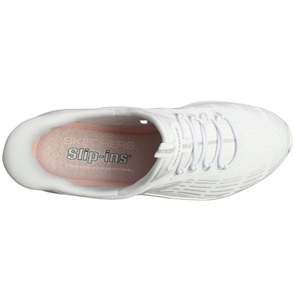 Step into effortless style and comfort with womens trainers from Skechers shoes. Designed with an elasticated lace and slip in heel offering effortless wear. The Skechers air cooled memory foam insole delivers plush and breathable cushioning. The white upper offers a clean base accented with silver finishes for a modern and chic style.