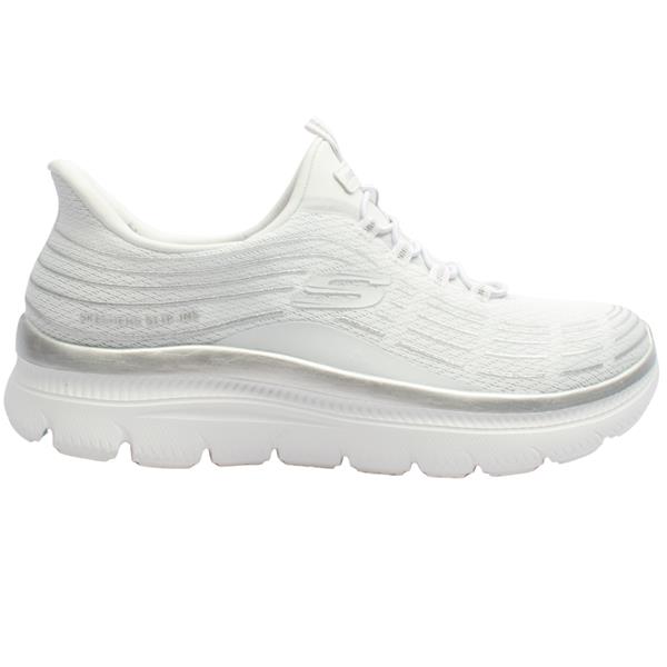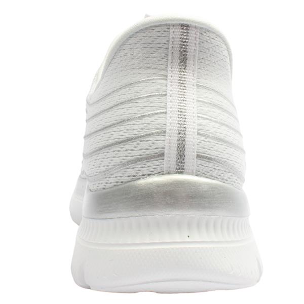 Brand: Skechers Style: 150611 Colour: White Silver Height: Approx. 4cm Closure: Slip in Removable Insole: No Materials: Textile/Synthetic upper, lining & manmade sole