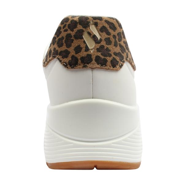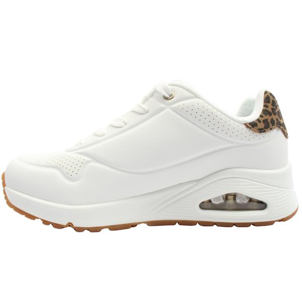 Step out in comfort with womens trainers from Skechers shoes. Smooth white synthetic upper with striking leopard print detail at the heel for a fun, modern touch. Lace up closure provides a secure and adjustable fit. White sole with a visible air bubble delivers lightweight cushioning and a trendy, sporty look. Memory Foam Air Cooled insole keeps feet soft, supported, and comfortable throughout the day.