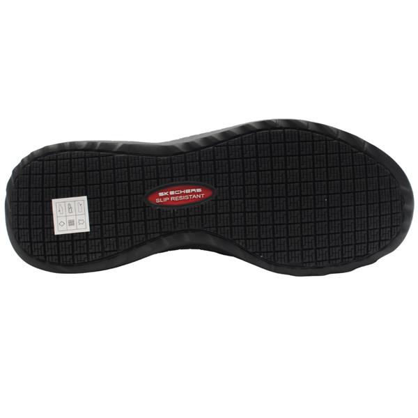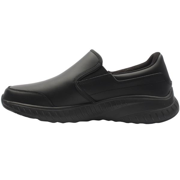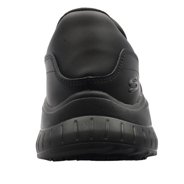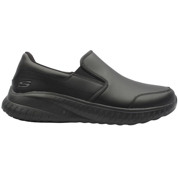 A comfortable and safe Mens Work Shoe from Skechers Shoes. This all black work shoe delivers a clean, versatile look while providing the protection and support required for work environments. Featuring a slip resistant outsole for improved traction on surfaces, this shoe helps you stay steady throughout your shift. The Skechers Air Cooled Memory foam insole offers all day cushioned comfort. The slip on design with elastic gussets ensure easy on/off wear. Lightweight cushioning and breathable materials enhance comfort, making it ideal for hospitality, healthcare & retail settings.