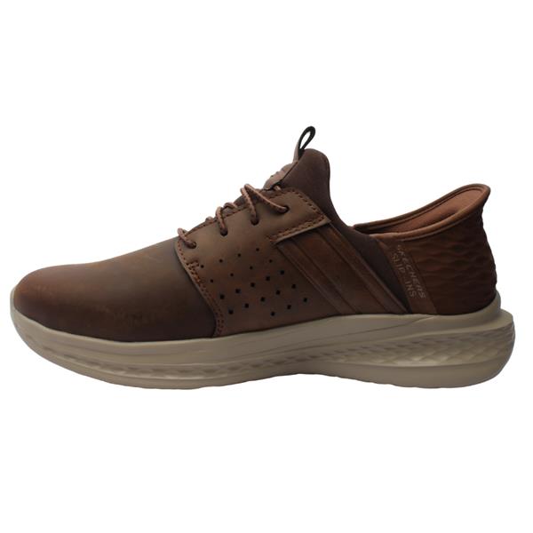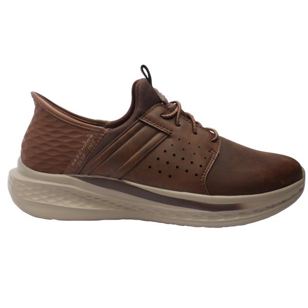 The Mens Skechers Hands Free Slip-ins (style number 210828) in Dark Tan are designed for effortless wear and superior comfort. Featuring Skechers exclusive Heel Pillow, these shoes securely hold your foot in place, allowing you to simply step in and go without using your hands. The Air-Cooled Memory Foam insole an gogamat arch provides breathable cushioning for all-day comfort. The lightweight and flexible design ensures ease of movement, making these slip-ons ideal for daily activities. Relaxed Fit for those with widder feet. Brand: Skechers Style: 210828 Colour: Dark Tan Wax Upper Removable Insole: No Width: Relaxed Fit Closure: Elastic Laces Materials: Leather/Manmade Upper, Manmade Insole, Manmade Outsole.