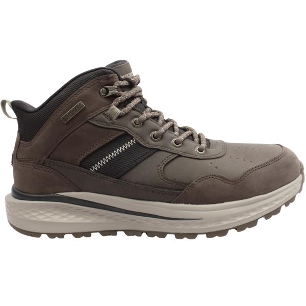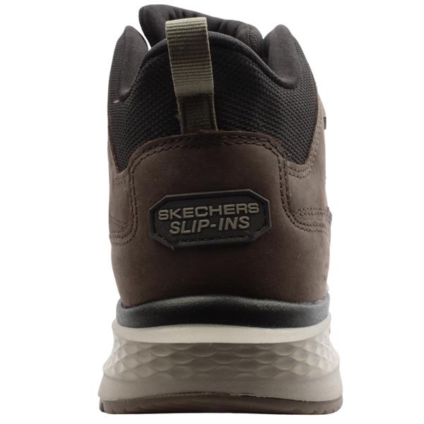 Mens waterproof boots from Skechers shoes. Designed to keep your feet dry in wet conditions, the boot's waterproof construction ensures protection. The combination of leather and mesh provides durability and breathability, enhancing comfort. Equipped with Skechers Slip ins technology, this boot allows for easy on and off. The Relaxed Fit design offers a roomier fit at the toe and forefoot. Designed with a Heel Pillow to provide additional comfort and support. Provides supportive cushioning to the arch area, enhancing overall comfort.
