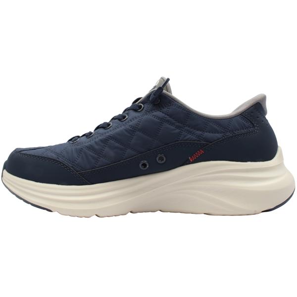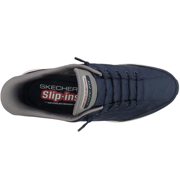 Experience effortless comfort with the mens trainers from Skechers shoes. Crafted with a navy textile upper this stylish sneaker combines soft quilted fabric with synthetic overlays for a breathable yet structured look. The innovative Hands Free Slip ins design lets you slide your foot in with ease. The unique Heel Pillow holds your foot securely in place while elasticated stretch laces provide flexible support without tying. Inside a Skechers Air Cooled Memory Foam insole delivers breathable, pressure relieving comfort with every step.