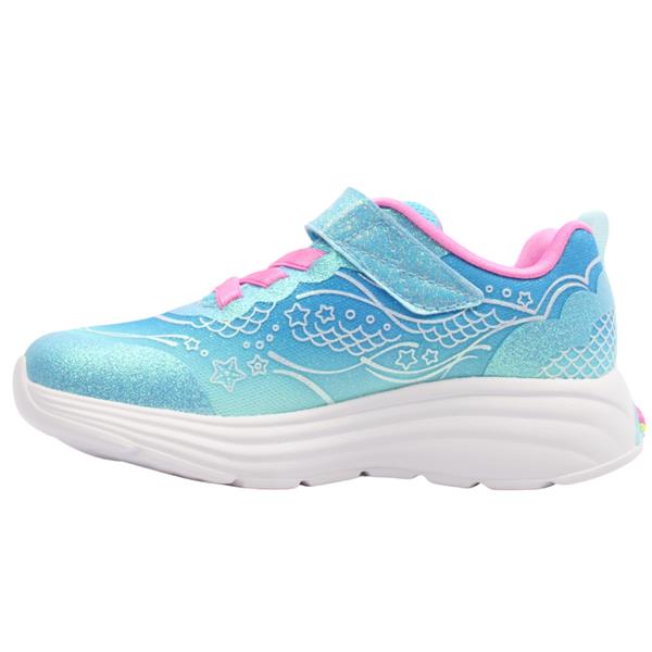 Make every step shine with the Skechers 303061N Mermaid Runner from the Magical Collection. Designed with playful pink ribbon style elastic laces and a single Velcro strap, these runners are easy to slip on and off while ensuring a secure fit. Flashing lights in the outsole add extra sparkle, making them the perfect mix of fun, comfort, and mermaid magic for little adventurers.