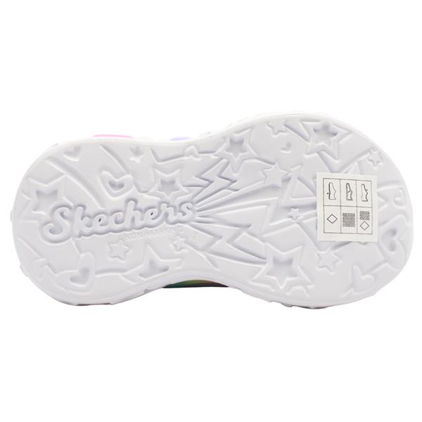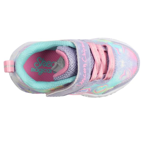 Bring magic to every step with these cute girls runners from Skechers shoes. The light up sole adds a sparkle to every step. Designed for easy wear the runner includes a combination of Velcro strap and elasticated laces. Featuring a lavender sparkle upper with playful multi colour hearts, these runners are as fun as they are comfortable.