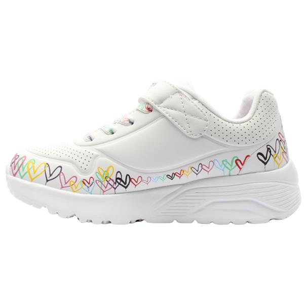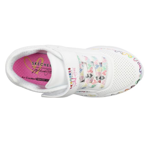 Step into style and comfort with the Skechers Girls Runners 314091L. Featuring a white upper with playful heart detailing, this sporty sneaker pairs fashion with function. The Air-Cooled Memory Foam insole provides cushioned comfort for all-day wear. Plus, these shoes are machine washable, making it easy to keep them looking as good as new.