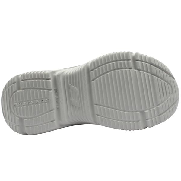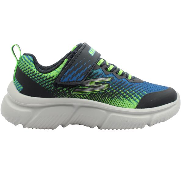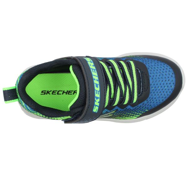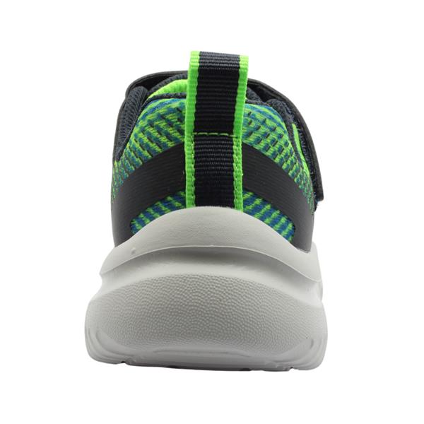 Sporty boys runners from Skechers Kids shoes range. The upper is soft woven navy/green mesh with black toe protector sitting on a greysole. The collar & tongue are padded for comfort. The elasticated laces, velcro strap and pull on tab to the rear ensure easy on/off.