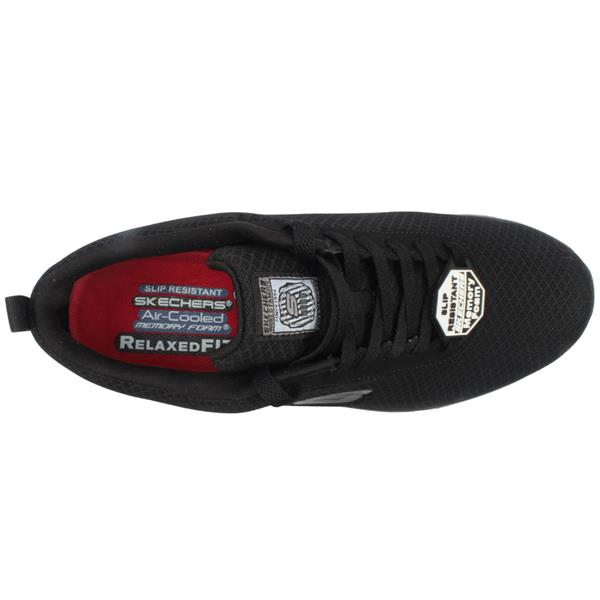 Lightweight casual shoe from the Skechers collection. The shoe has a black textile upper with a lace closure which allows for easy on and off. The shoe has an Air Cooled memory foam insole which adds to the comfort of the shoe. The shoe has a slip resistant sole which gives the wearer piece of mind in work. It also is a roomier fit for those who have slightly widder feet.