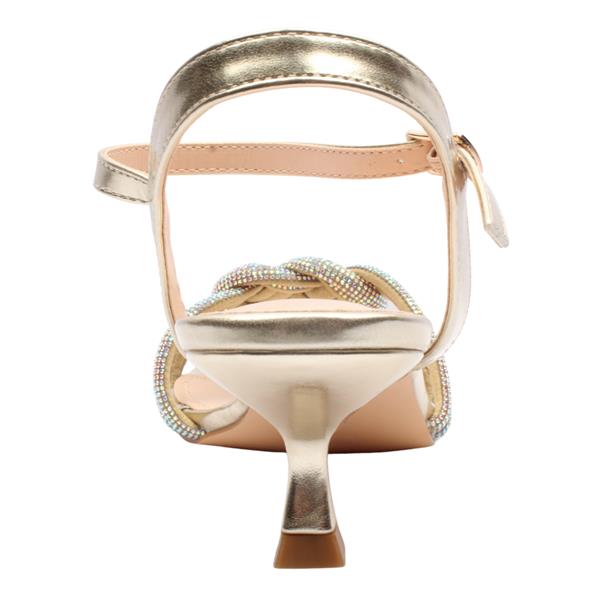 Add a touch of sparkle to your outfit with these dressy sandals from Sorento Shoes. These sandals feature a shimmering gold finish and intricately braided diamante embellished straps that add a touch of glamour to any outfit. The square toe offers a modern silhouette, while the adjustable ankle strap ensures a secure, customised fit. With a padded insole & a comfortable 5cm kitten heel, they effortlessly elevate both day and evening outfits, perfect for formal occasions or stylish nights out.