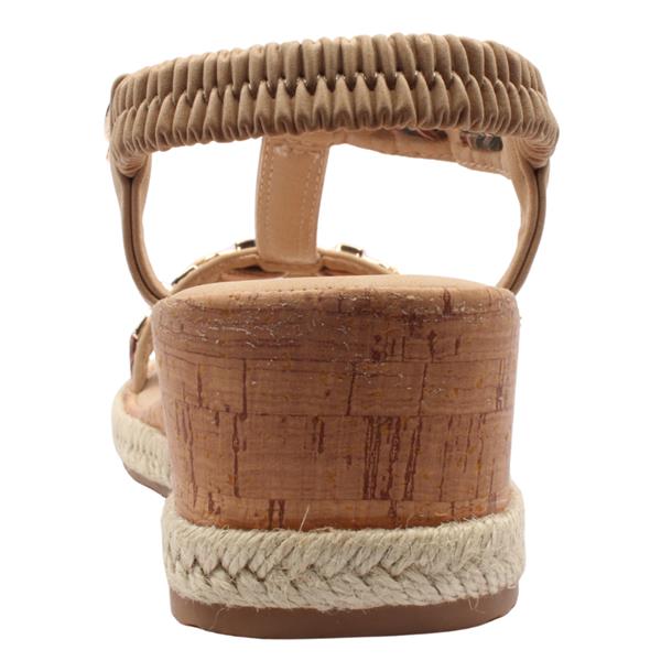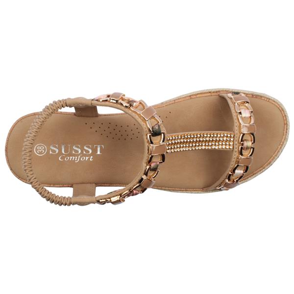 Style and comfort combine with these Ladies Sandals from Susst shoes, Krystal 26. These Ladies Wedge Sandals are designed for easy wear and have a convenient slip on design with a soft elastic heel strap, ensuring a secure and flexible fit. The gold & diamante detailed upper adds a touch of elegance, making it the perfect choice for both casual outings and dressier occasions. The comfortable wedge heel provides just the right amount of lift without sacrificing comfort and stability.