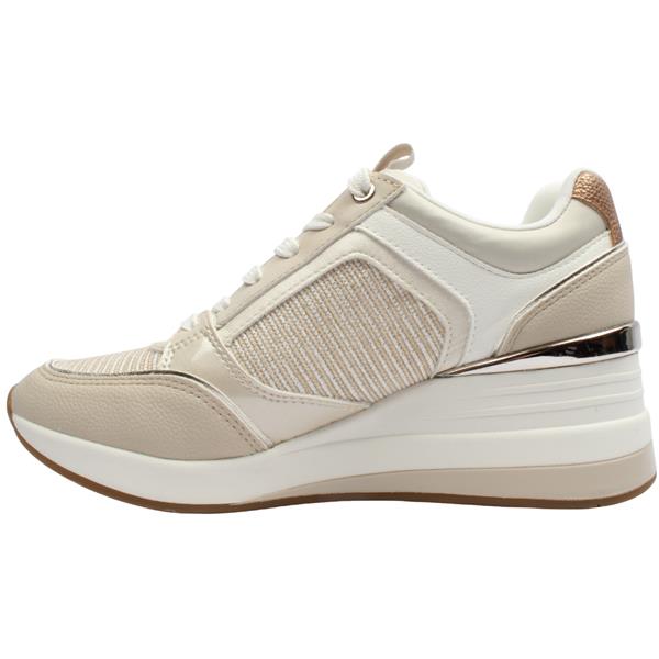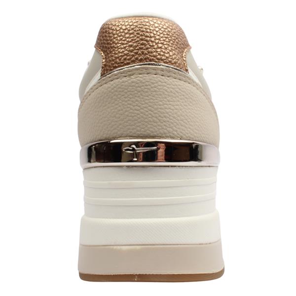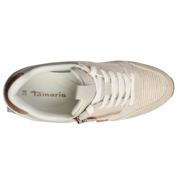 Combine sporty style with everyday comfort in the Tamaris wedge trainers 23703-41. Featuring a beige combi upper, these trainers blend textile and glossy patent panels for a modern, textured look that elevates casual outfits. Designed for both style and convenience, they include a lace for an adjustable fit alongside a side zip closure for easy on/off wear. The wedge sole adds subtle height while maintaining comfort and stability, making them ideal for all-day wear. Versatile and contemporary, these Tamaris wedge shoes are perfect for adding a polished touch to your casual wardrobe.