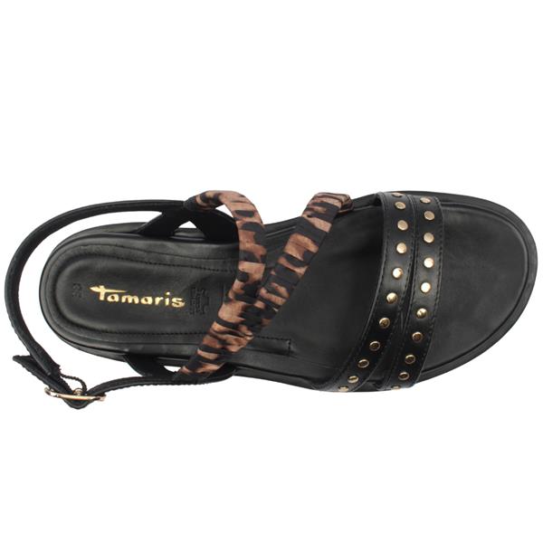 The Tamaris sandals 28227-46 are a stylish and versatile choice, perfect for adding a touch of flair to your summer wardrobe. Designed with a sleek black leather upper and the look is elevated with eye-catching gold stud detailing and leopard print straps, bringing a bold, on trend accent that contrasts beautifully with the black base and gives the sandal a fashionable finish. For all day comfort, the sandals are equipped with a Tamaris Shoes Touch-It insole, which adapts to the natural shape of your foot for a personalised feel and enhanced cushioning with every step. A buckle closure ensures a secure fit.