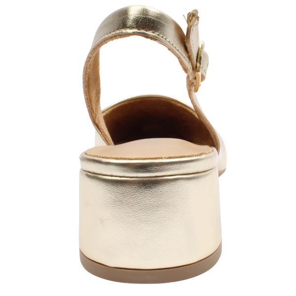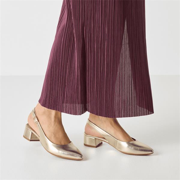Shine in effortless style with these elegant womens sling back heels from Tamaris shoes. The sleek gold upper adds a touch of glamour to any outfit while the pointed toe silhouette creates a refined and elongating look. Designed with practicality in mind the adjustable sling back strap with buckle ensures a secure and custom fit. The low block heel provides stable support and all day comfort.