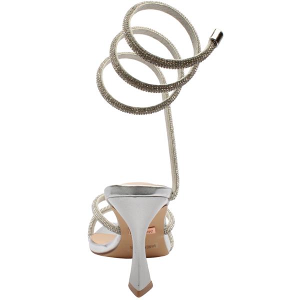 The perfect womens heel sandals from Una Healy for all your occasions. Crafted with a shimmering silver diamante upper it catches the light beautifully adding instant sparkle to any evening look. A striking swirl strap wraps elegantly around the leg creating a bold fashion forward silhouette. The intricate design balances drama with elegance.