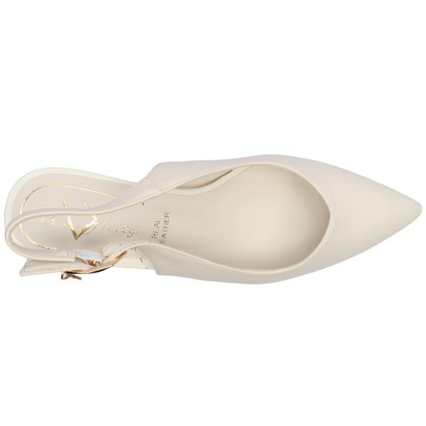 Womens sling back heels from Una Healy shoes. Designed with a soft cream upper it brings a timeless and sophisticated touch. The slingback design features an adjustable buckle ensuring a secure and personalised fit. A darker cream heel adds subtle contrast and a refined finish to the overall look.